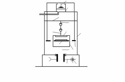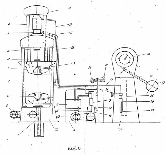 Functionarea. Se introduce epruveta de încercat la întindere în falca superioara 4 si se strânge prin apasarea mânerului 5. Se deplaseaza apoi falca inferioara 6 cu ajutorul electromotorului 8,pâna ce, între cele doua falci, este o distanta corespunzatoare lungimii epruvetei; apoi se prinde epruveta si în falca inferioara. Daca exista vreo indicatie asupra marimii sarcinii de rupere, se aseaza greutati pe pârghia 28,astfel ca precizia citirii sa fie cât mai buna. Se porneste apoi electromotorul 13 si se regleaza vi5teza de deplasare a falcii superioare,respectiv se regleaza debitul pompei, prin rotirea mânerelor 21 si 22. Dupa ruperea epruvetei, uleiul care a intrat în cilindrul 9 este readus în rezervorul 16, actionându-se ventilul 19 cu mânerul 21.
