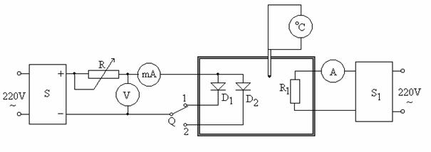 Se realizeaza schema de pe figura 2 cu comutatorul Q pe una din pozitiile 1 sau 2 fara sa cuplam incalzirea (Q1 deschis). Cu termometrul electronic se va masura temperatura ambianta T0 si se noteaza in tabel. Se alimenteaza schema de la sursa S cu o tensiune directa ai carei valoare se modifica conform tabelului 1. Pentru fiecare valoare a tensiunii se citeste valoarea curentului prin dioda si se noteaza in tabelul 1.