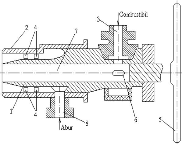 Distantierele 4 au rolul de a asigura pozitia coaxială a celor două corpuri. Corpul interior prin înfiletare în corpul exterior se poate deplasa axial fată de corpul exterior, reglând astfel cantitatea de abur destinată pulverizării. Acest reglaj se face prin roata de reglaj (manevră) 5.