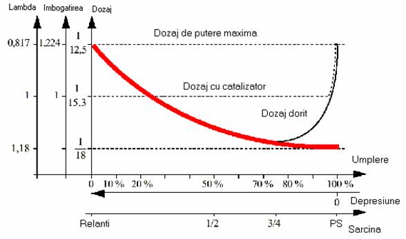 Pe de alta parte , pentru motoarele moderne cu sisteme de depoluare, se cauta ca amestecul sa fie foarte aproape de imbogatire 1 adica la un raport stoechiometric corespunzator dozajului ideal de 1/14,8.