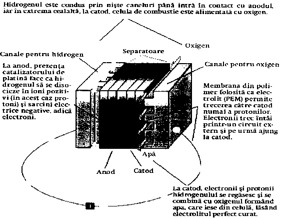 Sa spui ca în timpul reactiei dintre hidrogen si oxigen rezulta altceva decât energie calorica si apa ar fi doar o aberatie chimica. Azi totusi oamenii de stiinta au reusit sa creeze o grupa întreaga de polimeri, permeabili fata de trecerea protonilor, pe care îi folosesc ca electroliti în celulele de combustie. Scopul izolarii protonilor este dorinta de a-i "determina" pe electroni sa faca mai întâi "un ocol" înainte de a participa la reactia de ardere. Polimeriise plaseaza între cele doua placi: catod si anod.