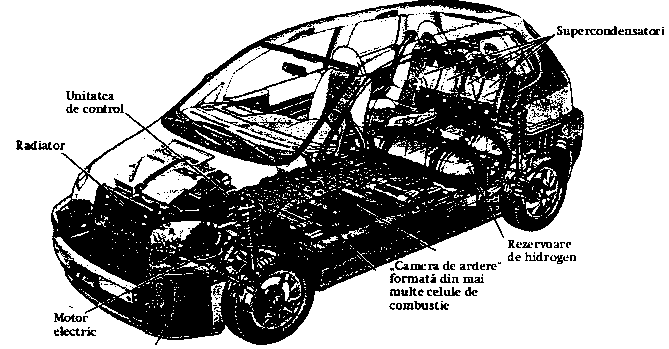 Ele sunt alimentate cu hidrogen din niste butelii, plasate sub bancheta din spate, iar motorul care învârte rotile este electric si este plasat sub capota, ca majoritatea motoarelor. La mijloc, sub podea, se afla bateria de celule de combustie, adica "centrala electrica" a masinii. Toate masinile care poarta inscriptia "Fuel Cell" se bazeaza pe acest sistem, dar, de regula, nu ard hidrogen, care este foarte scump, ci etanol produs din cereale (un fel de tuica cu gust prost).