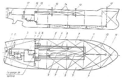 In fig.14 este reprezentata schema instalatiei de balast a unui cargou multifunctional de 15000 tdw (1- afterpic; 2- sorb; 3- pompa de balast; 4- armatura de inchidere; 5- valvula de fund (kingston); 6- caseta de valvule; 7- tanc lateral inferior de balast; 8- tubulatura de balast; 9- tanc de combustibil; 10- perete de coliziune; 11- forpic; 12- armatura de inchidere, cu actionare de pe punte, a comunicatiei cu forpicul; 13- armaturi de golire, cu actionare de pe punte, a tancurilor superioare laterale 14; 15- puntea principala; 16 filtru; 17- armatura de bordaj).