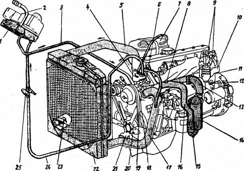 1 - radiatorul pentru incalzirea cabinei; 2 - conducta pentru purjarea aerului din radiatorul cabinei; 3 - conducta pentru apa racita dintre radiatorul pentru incalzirea cabinei si pompa de apa; 4 - conducta pentru iesirea apei calde din chiulasa, cu termostat; 5 - conducta pentru apa calda dintre chiulasa si radiatorul instalatiei; 6 - intrerupatorul instalatiei de incalzire a cabinei; 7 - rezervor de completare-compensare; 8 - surub de aerisire; 9 - spatiu de circulatie a apei intre peretii chiulasei; 10 - spatiu de distributie a apei la camasile de cilindru (rampa de apa); 11 - spatiu de circulatie a apei intre camasile de cilindru; 12 - robinet de golire a apei din bloc; 13 - conducta de apa intre radiatorul de ulei si bloc; 14 - radiatorul de ulei; 15 - robinet de golire a apei din radiator; 16 - conducta de apa intre pompa de apa si radiatorul de ulei; 17 -conducta de apa intre bazinul inferior si pompa de apa; 18 - pompa de apa; 19 - cureaua de antrenare a pompei de apa; 20 - fulia ventilatorului; 21 - ventilator; 22 - radiator; 23 - robinet pentru golirea apei; 24 - conducta pentru apa calda intre cotul termostatului si radiatorul de incalzire a cabinei; 25 - ventil de reglaj si inchiderea incalzirii cabinei.