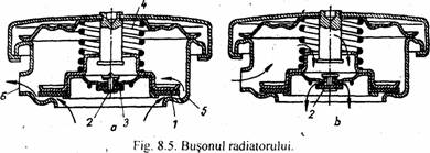 Radiatoarele au orificiul de umplere prevazut cu un buson (fig. 8.5), care, printr-o inchidere etansa, separa interiorul instalatiei de racire de atmosfera. Busonul este prevazut cu o supapa de suprapresiune 1 (o membrana elastica), sub care se gaseste, montata prin intermediul unei rondele si al unui nit 2, supapa de depresiune 3 (o garnitura de cauciuc). Supapa este fixata pe scaunul 5, prin intermediul arcului 4.