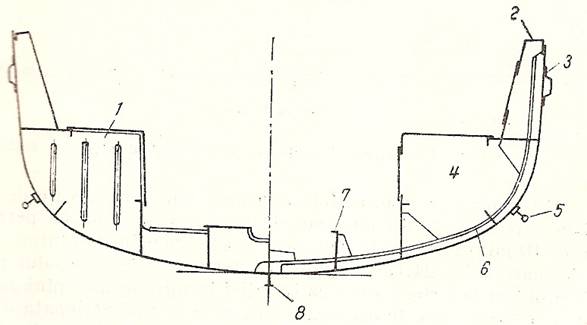 1 - perete transversal cheson; 2 - copastie; 3 - brâu; 4 - cheson aer; 5 - chila de ruliu; 6 - coasta; 7 - carlinga laterala; 8 - chila masiva.