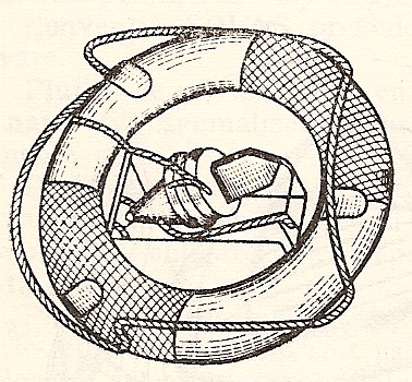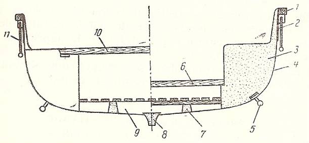 1 - copastie; 2 - centura; 3 - cheson cu umplutura; 4 - învelis; 5 - chila de ruliu; 6 - rezemator pentru picioare; 7 - carlinga laterala; 8 - chila; 9 - varanga; 10 - bancheta; 11 - tin-te bine.