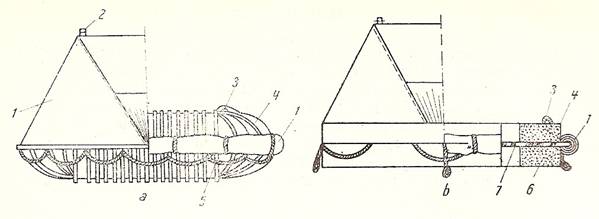 Tenda (acoperisul) se confectioneaza din cauciuc pinzat, ea rezemindu-se pe niste cadre-arc in care se insufla gaz. Ea are o forma semisferica astfel incit sa permita unui singur om de a aduce pluta in pozitie normala (din situatia de rasturnare).