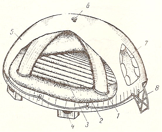 1 - cadru-arc; 2 - camera de plutire; 3 - fund; 4 - buzunare de apa; 5 - tenda; 6 - lampa; 7 - intrare; 8 - scarita de acces.