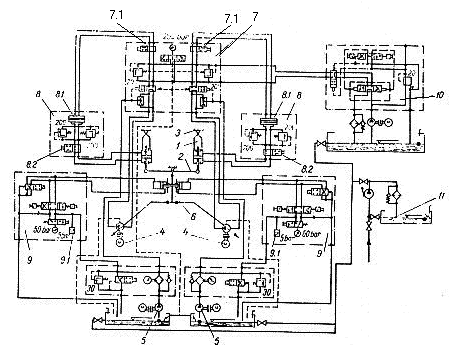 daca pierderea de ulei apare intre grupul de pompare si blocul hidraulic principal 7, masina poate fi pusa in functiune prin actionarea celui de-al doilea grup principal; daca acesta nu intra in functiune, inseamna ca pierderea de ulei se produce intre blocul principal 7 si unul dintre hidromotoarele liniare 1; masina poate fi repusa in functiune dupa intreruperea circuitului cu pierderi, prin actionarea robinetului 7.1 si izolarea cilindrului aferent cu ajutorul robinetului 8.2;