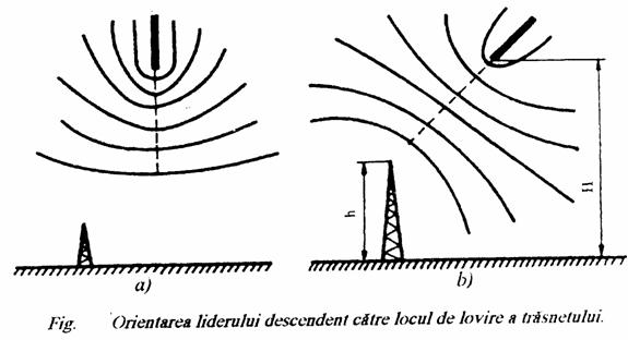 respective fiind reprezentate prin electrozi tija. Pentru fiecare caz studiat s-au determinat pozitiile reciproce ale electrozilor de modelare a paratrasnetului si obiectivului protejat pentru care descarcarea provocata de un impuls de tensiune, provenit de la un generator de impuls de tensiune a lovit tija - paratrasnet. Metoda admite ca efectul protector al paratrasnetului se manifesta din stadiul de leader descendent a descarcarii. Directia de propagare a liderului este determinata, in principal, de traseul pe care intensitatea campului electric este maxima. Aceasta directie este influentata, la inaltimi mari, exclusiv de canalul leaderului. Incepand cu o anumita inaltime (notata cu H in fig.20.5) numita inaltime de orientare a trasnetului, incepe sa se manifeste influenta obiectelor de pe sol, in particular a paratrasnetului, prin campul electric creat de sarcinile electrice ce se concentreaza pe acesta. Intensitatea campului devine maxima pe traseul ce uneste capul leaderului cu varful paratrasnetului, pe care apare contraliderul, directia de propagare in continuare a leaderului si locul de lovire a trasnetului fiind astfel bine determinate.