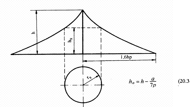 Zona de protectie a unui singur paratrasnet vertical are forma unui con de revolutie cu generatoarele curbe, asa cum se poate observa in fig.20.6, constructia zonei de protectie fiind data in fig.20.7.