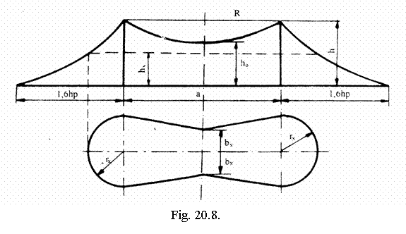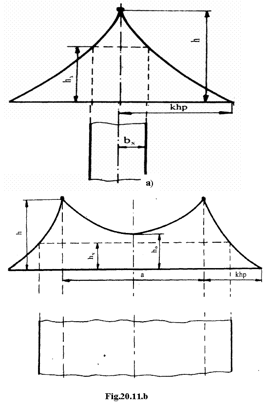 Constructia zonei de protectie a doua paratrasnete verticale de aceeasi inaltime este data de fig.20.8. Portiunea exterioara a zonei de protectie se construieste la fel ca si pentru un singur paratrasnet. Portiunea interioara a zonei de protectie este determinata in partea superioara de un arc de cerc care trece prin varfurile paratrasnetelor si prin punctul aflat la mijlocul distantei dintre paratrasnete, la inaltimea data de relatia (20.3) si de dreptele care se intalnesc, in plan orizontal, la distantele hx, de planul paratrasnetelor: