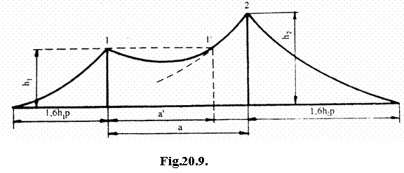 In cazul a doua paratrasnete verticale de inaltimi diferite, se incepe cu construirea zonei de protectie a paratrasnetului mai inalt ,(fig.20.9). Apoi, prin varful paratrasnetului de inaltime mai mica se duce o orizontala pana la intersectia cu limita zonei de protectie a paratrasnetului mai inalt, in punctul de intersectie considerandu-se un paratrasnet fictiv de inaltime egala cu primul. In continuare, se procedeaza ca si la construirea zonei de protectie a doua paratrasnete de inaltime egala. Conditia ca paratrasnetele sa formeze o zona comuna este in acest caz a' £7h1p.