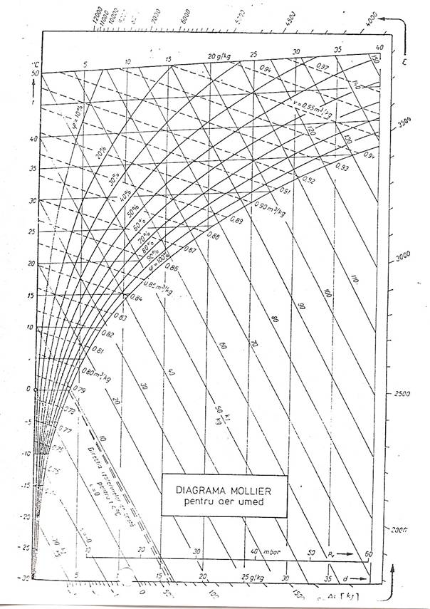 In practica de proiectare si exploatare, pentru determinarea parametrilor aerului umed se utilizeaza diagrama Mollier, reprezentata in figura de mai jos: