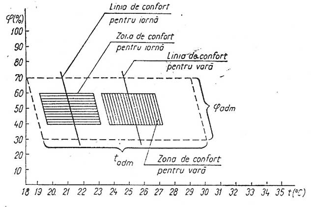 In figura de mai jos este reprezentata diagrama de confort construita cu ajutorul parametrilor de confort ai aerului, conform normelor sanitare dupa care se construiesc navele romanesti: