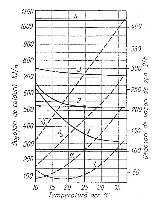Valorile de calcul ale cantitatilor de caldura si vapori de apa degajate de corpul omenesc sunt reprezentate in figura de mai jos: