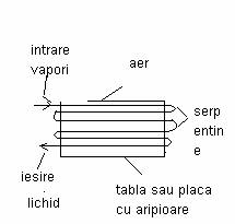 b)condensatoare racite cu aer sunt caracteristice inst frig de puteri medii si sunt alcatuite din tevi de cupru, aluminiu sau otel fara sudura cu diametre de 3/8 -1/2” mai rar de 1” pt amoniac indoite in serpentine si prevazute cu aripioare pt marirea suprafetei de schimb de caldura.