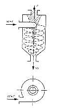 a) sicane sus-jos-sus (fig.20,a) la care, dupa separarea centrifugala, traiectoriile celor doi componenti, apa (w) si reziduuri (r), antrenati in sedimentare gravitationala, nu se intersecteaza;