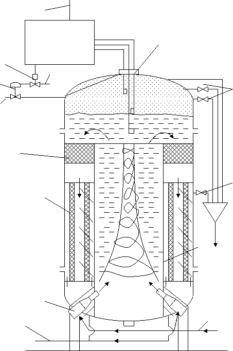 1- racord de intrare amestec; 2- robineti de prevelare probe, evacuare hidrocarburi si aerisire; 3- alimentare electrica; 4- bloc traductori nivel; 5- servovalvula; 6- valvula pneumatica fluture; 7- tor de aglomerare pe inele; 8- filtru volumic; 9- hidrocicloane; 10- racord evacuare hidrocarburi separate; 11- racord de alimentare cu aer comprimat; 12- racord evacuare apa tratata; 13- coloana de sedimentare.