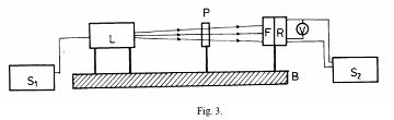 Pe bancul de lucru B se afla: un laser cu He-Ne (L) alimentat de la o sursa de curent (S ), o fotorezistenta (F) legata la o sursa stabilizata de curent continuu (S ); o rezistenta (R) dupa care se culege semnalul indicat de voltmetru (V si un suport (P) pentru prinderea lentilei sau a obiectelor difractate (fir, sita) (Fig.3).