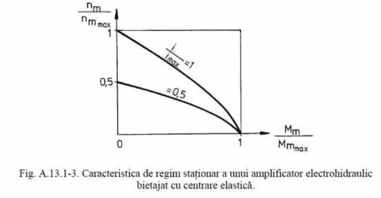 Īn coordonate adimensionale, caracteristica amplificatorului si motorului are forma din figura A.13.1-3. Debitul amplificatorului variaza practic liniar cu intensitatea curentului de comanda. Efectul fortei hidrodinamice poate fi atenuat prin utilizarea unor resoarte foarte rigide.
