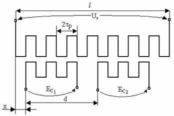 Acesta este echivalent cu un selsin multipolar desfasurat în plan, la care rotorul este o rigla a carei lungime trebuie sa acopere domeniul maxim de masurare, iar statorul este un cursor ce se deplaseaza deasupra riglei. Pe rigla si pe cursor se gasesc înfasurari realizate din folie de cupru imprimate prin procedee speciale (serigrafice). Rigla are o singura înfasurare, iar cursorul are doua înfasurari, toate r 212c23c ealizate cu acelasi pas, figura 4.19.
