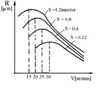 Cea mai mare influenta asupra marimii rugozitatii o are viteza de aschiere si avansul. In diagrama din figura 8.7 [24] s 434i83e e poate observa ca rugozitatea scade cu cresterea vitezei de aschiere si se mareste daca avansul creste. Valorile mai mari ale rugozitatii din jurul vitezei de 20 - 30 m/min. se datoresc faptului ca la aceasta viteza de aschiere apar conditii favorabile depunerilor pe tais, care prin rupere periodica se imprima in material.