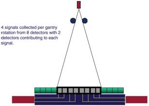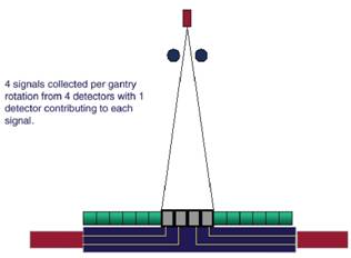 4 X 5,0 mm- Pot fi colectate patru semnale (axial) sau structuri în spirala cu intervale si intercalare de la linii de detector de 12-1,25 mm cu patru rânduri de detector contribuind la fiecare semnal (axial) sau structuri în spirala cu intervale sau intercalare.