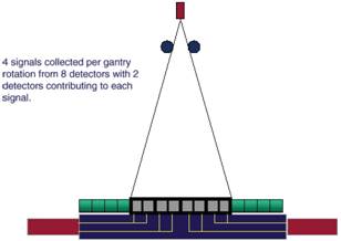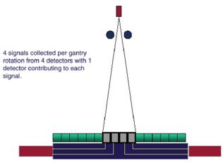 4 X 2,5 mm- Pot fi colectate patru semnale (axial) sau intercalare sau structuri în spirala c u intervale si intercalare de la opt rânduri de detector de 1,25 mm cu doua rânduri de detector contribuind la fiecare semnal (axial) sau structuri în spirala cu intervale sau intercalare.