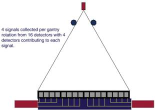 Exista 16 celule de detector în directia Z. Cele patru rânduri exterioare pozitionate pe fiecare parte a celulelor de detector au 1,25 mm în directia Z. Cele 16 randuri centrale au 0,625 mm în directia Z. Sunt adunate pîna la patru semnale pe rotatie de cadru. Fiecare semnal poate fi colectat de la un rând individual de detector sau o combinatie de doi detectori. Pot fi luate patru semnale de la 16 celule (sau patru parti pe rotatie de cadru).