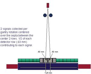 Exista 64 celule de detector în directia Z. Cele patru linii exterioare situate pe fiecare parte a detectorului au 1,25 mm în directia Z. Cele 16 linii centrale au 0,625 mm în directia Z. Sunt adunate pîna la 16 semnale pe rotatie de cadru. Fiecare semnal poate fi colectat de la un rând individual de detector sau o combinatie de detectori. Pot fi luate 64 semnale de la 64 celule de detector (sau 64 parti pe rotatie de cadru).