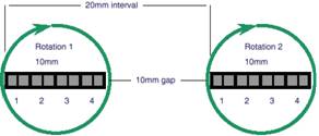 Intervalul este egal cu numarul imaginilor pe rotatie X grosimea partii, de exemplu în cazul modului 4 X 2,5 - sunt generate patru imagini, fiecare cu o grosime de 2,5 mm cu o acoperire totala de 10 mm pe rotatie. Intervalul pe rotatie va fi de 10 mm.
