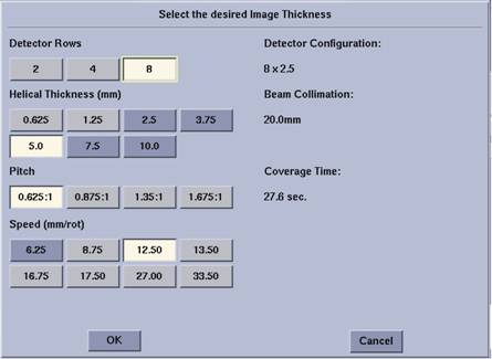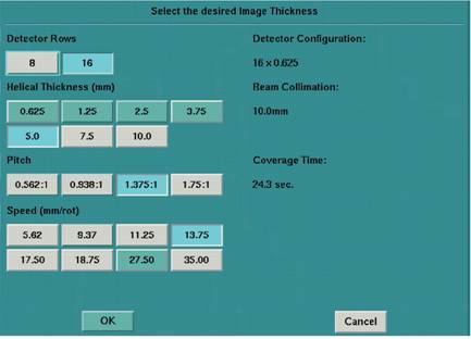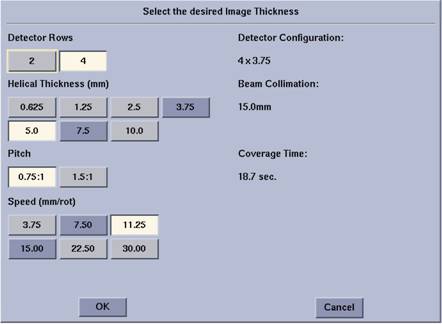 Interfata utilizatorului arata variantele de grosime ale partii, numarul imaginilor pe rotatie, si optiunile retrospective. Parametrii selectati pentru a seta grosimea partii si viteza determina configurarea detectorului.