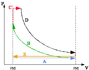P Presiune. V Volum. PMS Punct Mort PMI Punct Mort Inferior. A Admisie. B Compresie. C Ardere. D Destindere. E Evacuare. |
