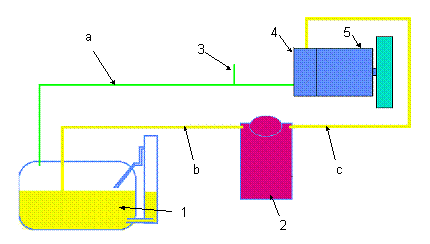 Pompa de joasa presiune (pompa de transfer) este de tip volumetric. Aceasta permite, pe de o parte, aspirarea motorinei din rezervor si pe de alta parte, de generare a unui debit catre pompa de înalta presiune. Presiunea este controlata printr-un regulator fie mecanic (cu ajutaj la capat de circuit pentru o pompa rotativa) fie electric (Common rail). 1 - regulator 2 - pompa 3 - filtru 4 - rezervor A - presiune de transfer B - joasa presiune |