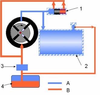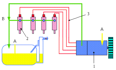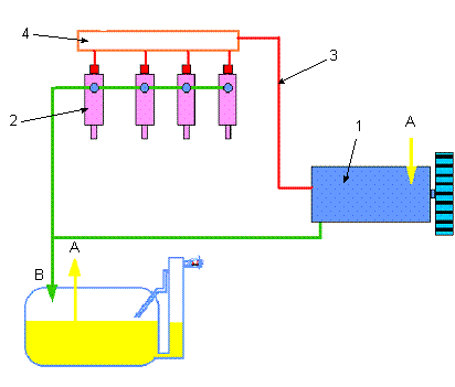 1 - Pompa înalta presiune 2 - Injector 3 - Conducta înalta presiune 4 - Rampa de injectie A - Circuit de alimentare de joasa presiune B - Circuit retur la rezervor |