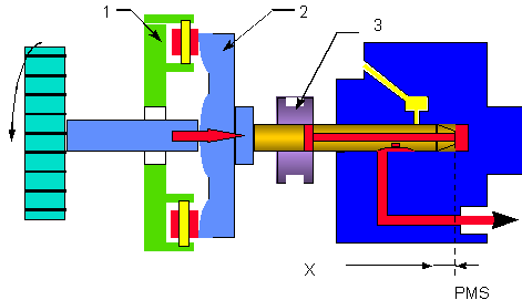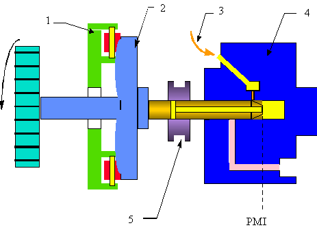 1 Arbore cu came. 2 Piston. 3 Inel cu came. |