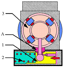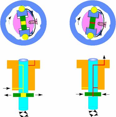 Un arbore cu came (1) antrenat de un motor, care actioneaza alternativ cele trei pistoane (2) prin intermediul inelului cu came (3).