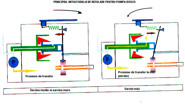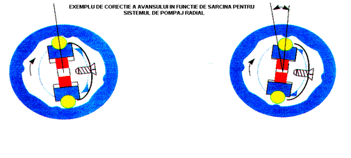 Sarcina motor Corectiile sunt necesare în functie de principiul de pompaj. La pompele rotative cu pistoane radiale se constata o variatie naturala a avansului în functie de sarcina care trebuie sa fie considerata pentru evitarea emisiilor de fum si a zgomotelor de motor. Adica, începutul injectiei este variabil deoarece galetii ataca inelul cu came în functie de cantitatea de motorina (sarcina) care patrunde între cele doua pistoane plonjoare.