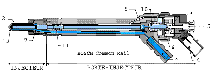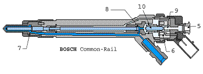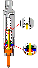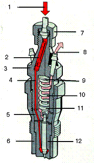 Deschidere injector: Când calculatorul comanda deschiderea supapei (10) prin alimentarea alimentarea bobinei (6), camera superioara (8) este pusa la retur (5). În acest caz echilibrul fortelor se pierde, presiunea se exercita în camera inferioara (7) ducând la ridicarea acului injector; injectia începe. Injectia dureaza atât cât bobina este alimentata. |