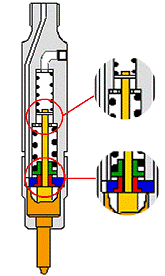 La pre - injectie. La trecerea de 200 bari, presiunea pe ac exercita o forta mai mare decât arcul superior. Acul se deplaseaza si vine în contact cu inelul rosu. |