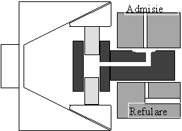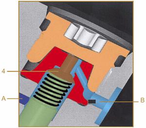 În timp ce pistonul coboara, alimentarea de joasa presiune care intra prin orificiul B deschide clapeta (4). Carburantul umple cilindrul. În momentul reurcarii pistonului, clapeta se închide, carburantul este pus sub presiune si evacuat prin orifciul A. A Orifciul de refulare. B Orificiu de admisie.