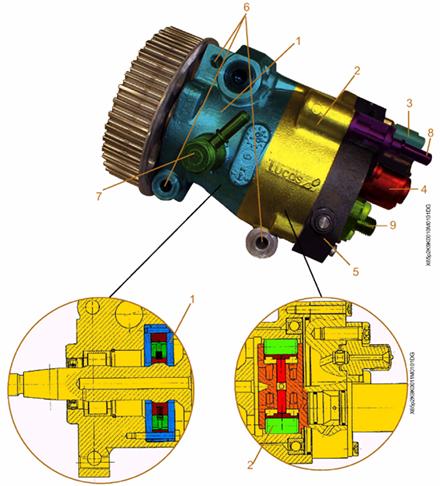 1 Iesirile înaltei presiuni catre injectoare. Captor de presiune. Intrare înalta presiune venind de la pompa. |
