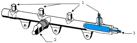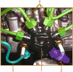 Motorina comprimata prin elementul de pompaj este acumulata sub înalta presiune în rampa comuna. Aceasta rezerva de motorina este apoi distribuita la injectoare prin conductele de înalta presiune. 1 Rampa comuna. 2 Captor de presiune. 3 Intrare înalta presiune. 4 Iesiri înalta presiune. |