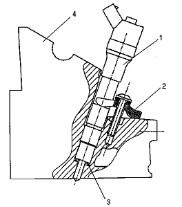 Înlocuirea garniturii este obligatorie la demontarea injectorului. 1 Injector electromagnetic Common Rail. 2 Brida injector. 3 saiba de etansare. 4 Chiulasa. |