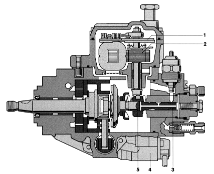 1 Captor de cursa sertar regulator. 2 Actuator pentru debit de injectie. 3 Piston de refulare. 4 Electrovana pentru început de injectie. 5 Sertar regulator (manson). |