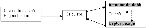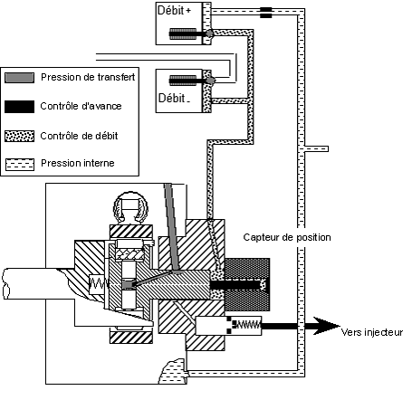 Pozitia rotorului, masurata printr-un captor inductiv, este controlata comandând electrovanele "Débit +" si " Débit -". Deschiderea electrovanei (-) aduce presiunea de transfer respingând rotorul catre debitul nul, pe când electrovana (+) permite evacuarea carburantului, permitând arcului de revenire a rotorului catre pozitia de debit maxim. |