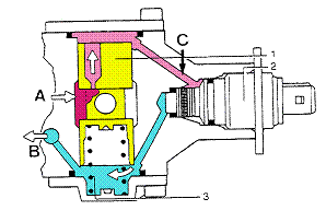 Actuatorul de avans. A - Intrare presiune de transfer B - Descarcare catre alimentare pompa C - Canal de gestionare a presiunii 1 - Cric avans 2 - Electrovana de avans 3 - Arc de avans automat |