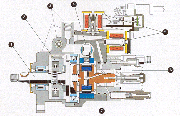 Motorul antreneaza cama rotativa (1). În timp ce electrovana (3) se deschide, carburantul sub presiune de alimentare intra în cilindrul de pompaj si departeaza pistoanele (2).